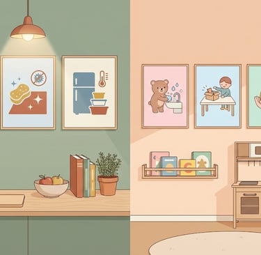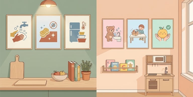 Visual posters for the kitchen and kids’ rooms that teach food safety, hygiene, and safe habits using simple icons and minimal text, suitable for both adults and children.